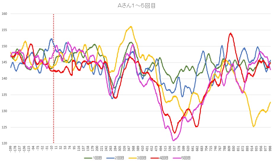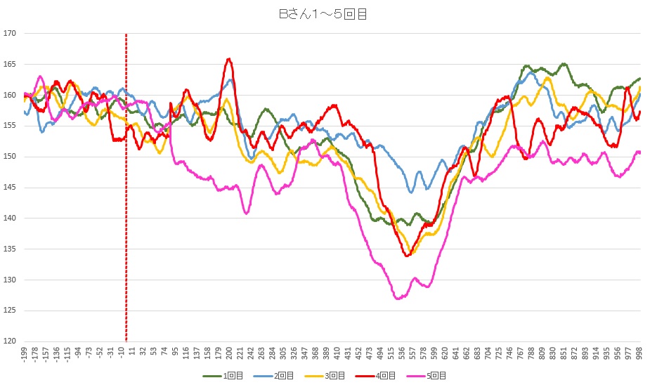 60歳代男性Aさんと70歳代女性Bさんに週に1回、 有酸素運動課題に脳活性を促す認知課題を同時に負荷するコグニサイズ運動をしてもらい 運動前の事象関連電位を計測。 (運動前に測る理由は通常時の脳波を計測すべきであり、運動後は通常時ではない為) 5回計測し、波形の順番は、緑-青-黄-赤-桃色 谷(P300)の深さ(振幅)が深ければ認知力が高く、谷のボトムの位置(潜時)が左よりであれば注意力が高い。